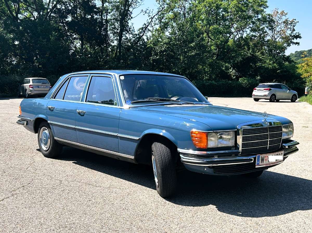 Tauchen Sie ein in die Eleganz der 70er Jahre mit diesem teilrestaurierten Mercedes-Benz W116 280S, Baujahr 1977, in einem edlen blauen Farbton, der Stil und Klasse perfekt verkörpert.