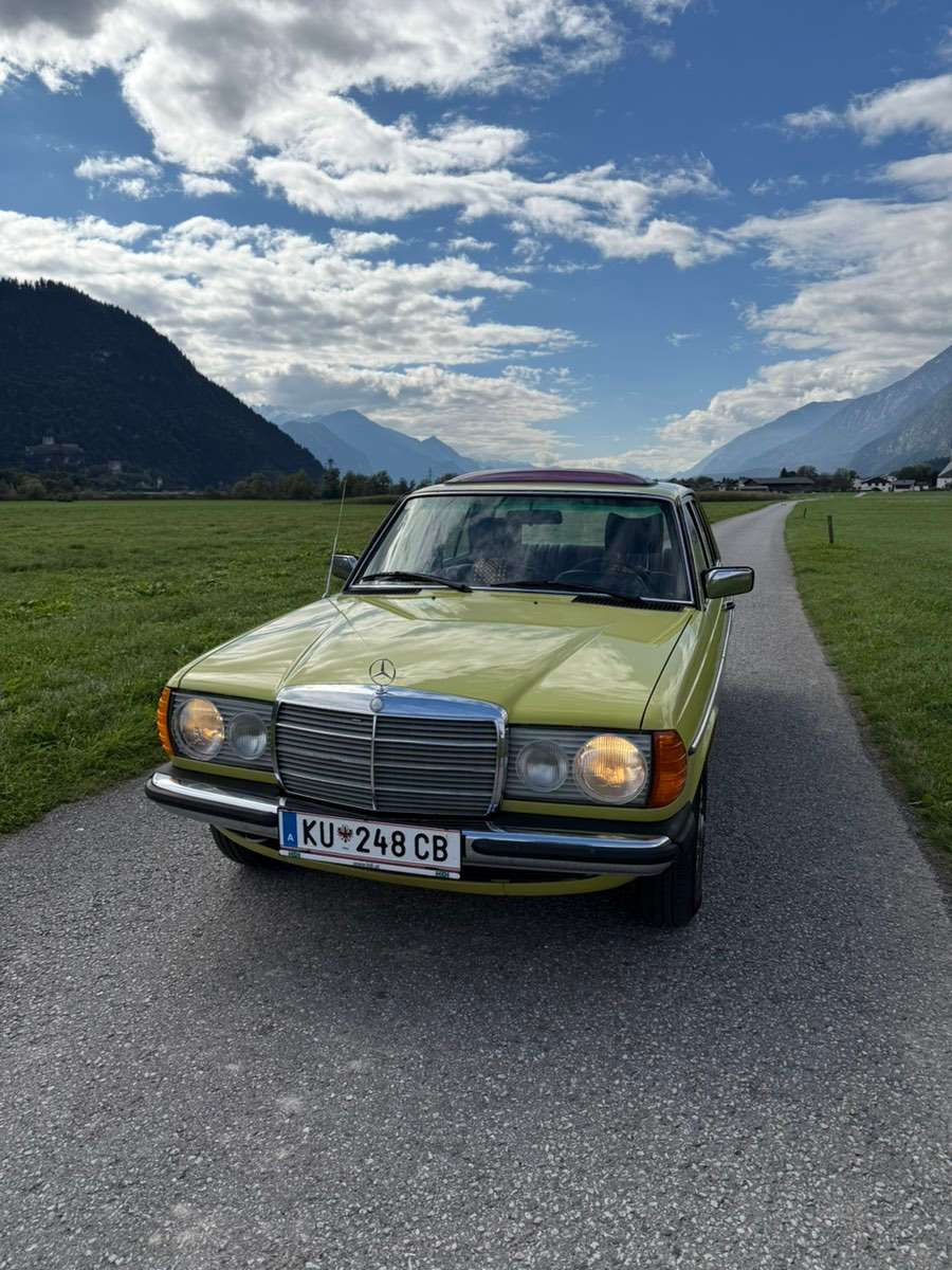 Es handelt sich um das gefragte Vorfacelift-Modell mit den schönen Ochsenaugen-Scheinwerfern, sehr beliebt bei Sammlern. Ursprünglich 200D, bereits vor vielen Jahren auf den stärkeren 240D-Motor umgebaut – damals gängige Praxis, bringt deutlich mehr Fahrspaß.
