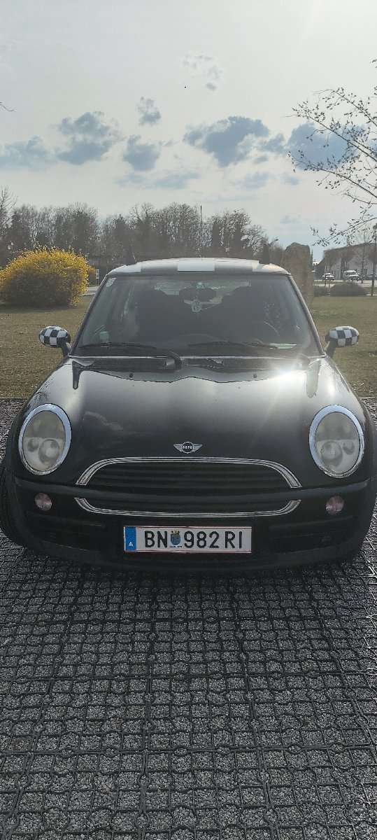 Ich verkaufe meinen Mini One in klassischem Schwarz mit auffälligem Dach im Schachbrettmuster – ein echter Hingucker auf der Straße!