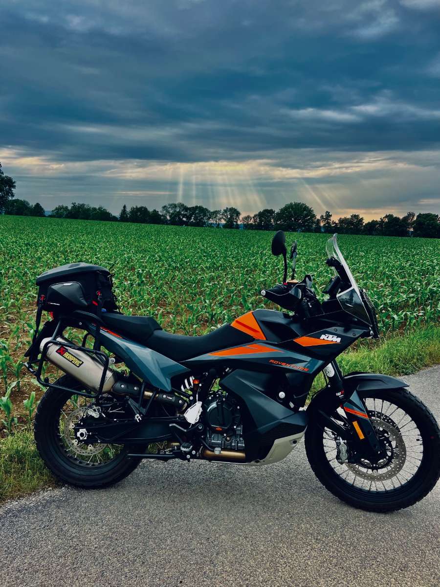 Umfangreich ausgestattete 890 Adventure mit Tech-Paket, Navivorbereitung Powerparts, Kipphebel, Softbag-Seitentaschen GIVI, Anakee Wild Bereifung, Akrapovic-Auspuff,