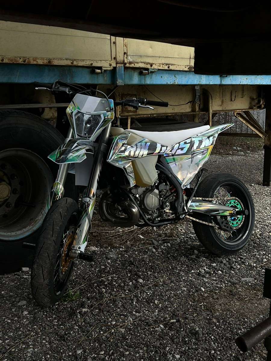 Weiteres wurde die Maschine von mir komplett umgebaut auf Supermoto Reifen und neuem Dekor usw.