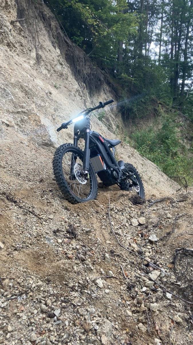 Verbaut ist ein BAC4000 Controller, dadurch hat sie deutlich mehr Leistung und spricht viel direkter an als im Originalzustand und Magura MT7 Bremssnlagen da die originalen Bremsen keine gute Bremsleistung haben.Außerdem ist ein 16 Zoll MX Hinterrad von DMX Bikes drauf, was im Gelände echt einen Unterschied macht (bessere Traktion). Ein Eggrider Display ist auch verbaut und man kann alles easy übers Handy einstellen. Für Nachtfahrten ist ein Xenon Scheinwerfer drauf und zusätzlich MX Fußrasten für besseren Halt beim Fahren.