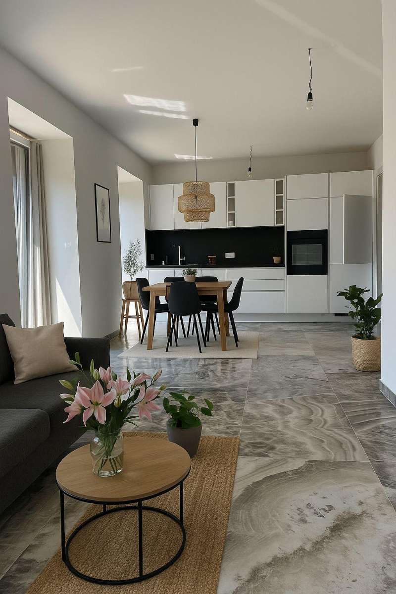 Der offen gestaltete Wohn- und Essbereich bildet das Zentrum der Wohnung und überzeugt durch großzügige Fensterflächen, die für ein helles, freundliches Wohnambiente sorgen und den Innenraum harmonisch mit dem Außenbereich verbinden.