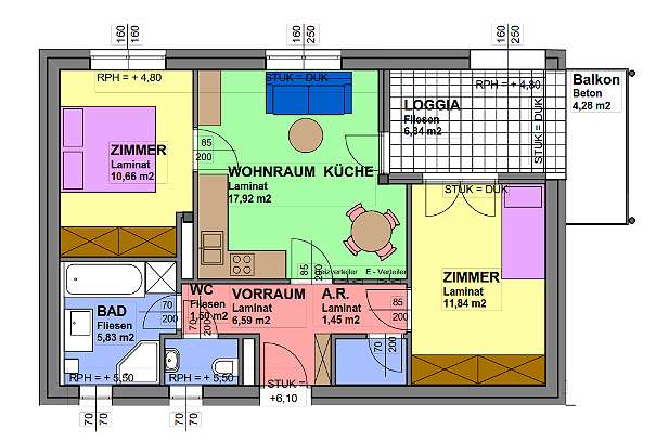 Neben der Grundausstattung ist die Zimmeraufteilung sehr gut, die Loggia und Balkon sind von 2 Räumen aus zugänglich.