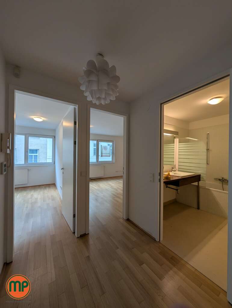 Dank der riesigen Fenster verwöhnt einen diese Wohnung täglich mit viel Sonnenlicht. Der helle Parkettboden unterstreicht diesen Wohlfühlfaktor noch mehr. Alle Räume sind separat über das Vorzimmer begehbar und somit absolut praktisch angelegt. Die vollausgestattete Küche befindet sich in einer großzügigen Nische im Wohnzimmer, wo durch sich trotz einer "Wohnküche" eine klare Abgrenzung der Küche ergibt. Das modern eingerichtete Badezimmer mit großem Spiegel und Holzelement vollenden Ihr neues Zuhause.