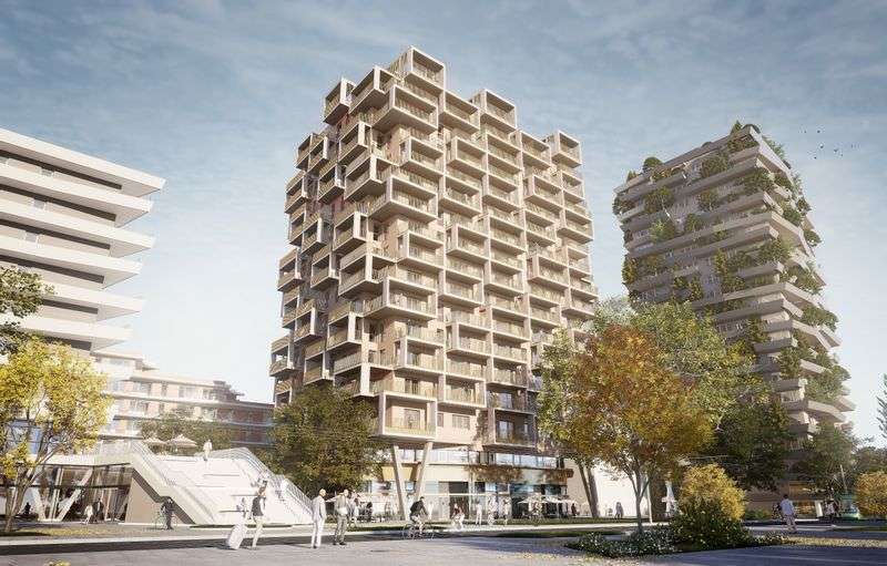 Der goldene Wohnturm im Quartier 1 erstreckt sich über 16 Etagen. Die Fassade wird durch Boxen aufgelöst, die großzüge Außenräume und Terrassenflächen für die Wohnungen bieten. Die goldenen Balkone der Esplande Sieben verleihen dem Gebäude eine besondere Eleganz und machen es zu einem Blickfang in Reininghaus.