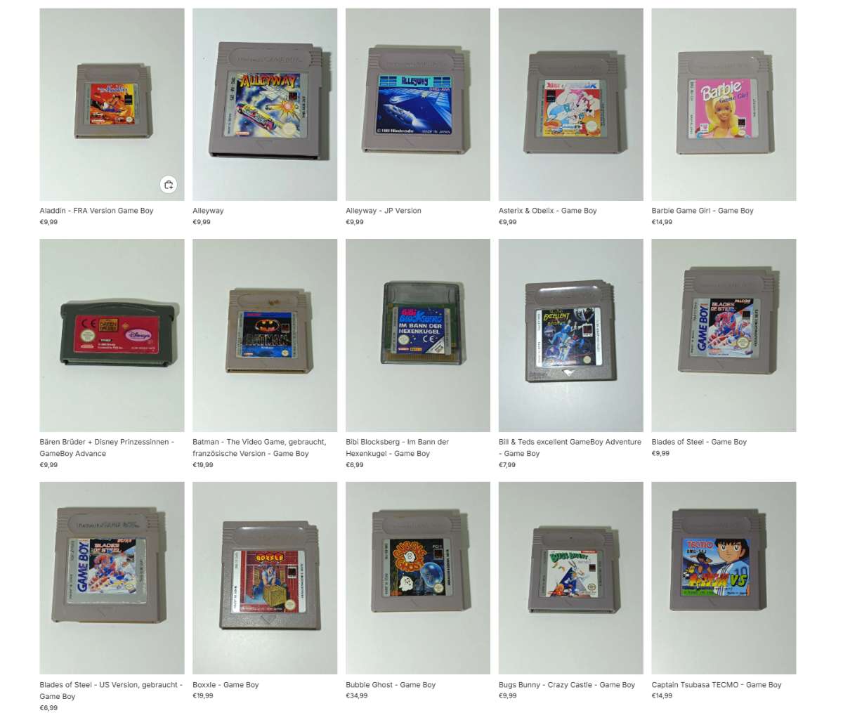 Aladdin, Alleyway, Asterix und Obelix, Barbie, Bärenbrüder + Lion King, Bärenbrüder + Prinzessinnen, Batman The Video Game, Bibi Blocksberg, Bill und Teds Excellent Gameboy Adventure, Blade of Steel, Boxxle, Bubble Ghost, Bugs Bunny Crazy Castle, Castlevania Legends, Crazy Bikers, Dennis, Donkey Kong Land, Doraemon 2, Dragons Lair, Dropzone, Duck Tales, Duck Tales 2, Duke Nukem, F1 Race, F1 Spirit, Fall of the Foot Clan, Gameboy Gallery 5 in 1, Gargoyles, Glücksrad, Golf, Gremlins 2, Hardcore Pool, Hercules, Hugo, Hugo 2 1/2, LEGO Insel 2, Kick Off, King of the Ring, Kirbys Dream Land 2, König der Löwen, Kwirk, Nigel Mansell's World Championship, MAX, Mega Man Willy's Rache, Mickey Mouse V, Micro Machines, Motocross Maniacs, Mr Chin's, Ms Pac Man, Othello, Quest for Camelot, Pac in Time, Pagemaster, Paperboy, Paperboy 2, Parasol Stars, Puzznic, Pokémon Blattgrün, Pokémon Blau, Pokémon Feuerrot, Pokémon Gold, Pokémon Kristall, Pokémon Rot, Pokémon Rubin, Pokémon Saphir, Pokémon Silber, Pokémon TCG, Popeye, Power Rangers, QIX Adventure, Rayman, Revenge of the Gator, Rodland, Skate or Die, Small Soldiers, Spider-Man, Soccer, Solomon's Club, Speedy Gonzales, Star Trek, Super Mario Bros 3, Super Mario Deluxe, Super Mario Land 2, Super RC Pro AM, Tennis, Tetris, Tetris Worlds, The Blues Brothers, The Flintstones, The Lion King, Tiny Toon, Tip Off, Tonic Trouble, Top Ranking Tennis, Tsubasa Captain Tsubasa, Uno, V Rally, Wave Race, Worms Armageddon, Yoshis Universal Gravitation, Zelda Oracle of Ages