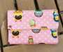Genäht aus einem bunten getupften Baumwollstoff. Kätzchen, Äffchen, Mäuschen und Fröschchen verzieren den Stoff. Der Innenstoff ist ein gelb-orangener Punktestoff. Verschließbar durch einen farblich abgestimmten hellgrünen Druckknopf.
