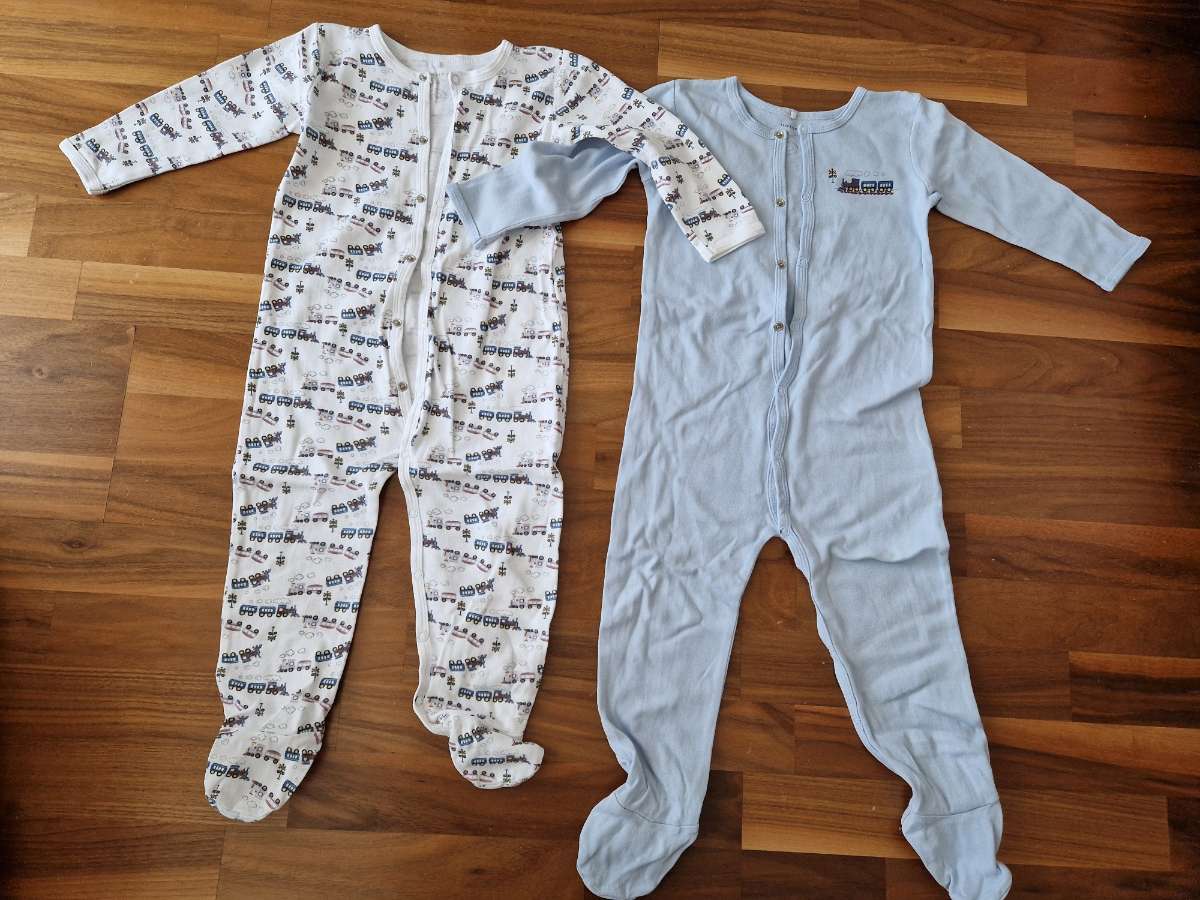 1 Schlafanzug ist weiß mit Zügen aufgedruckt und 1 Schlafanzug ist blau mit einem Zug darauf. Die Schlafanzüge haben Druckknöpfe zum schließen. Die Schlafanzüge sind gebraucht, in sehr gutem Zustand sowie gewaschen und gebügelt. Privatverkauf, keine Gewährleistung.