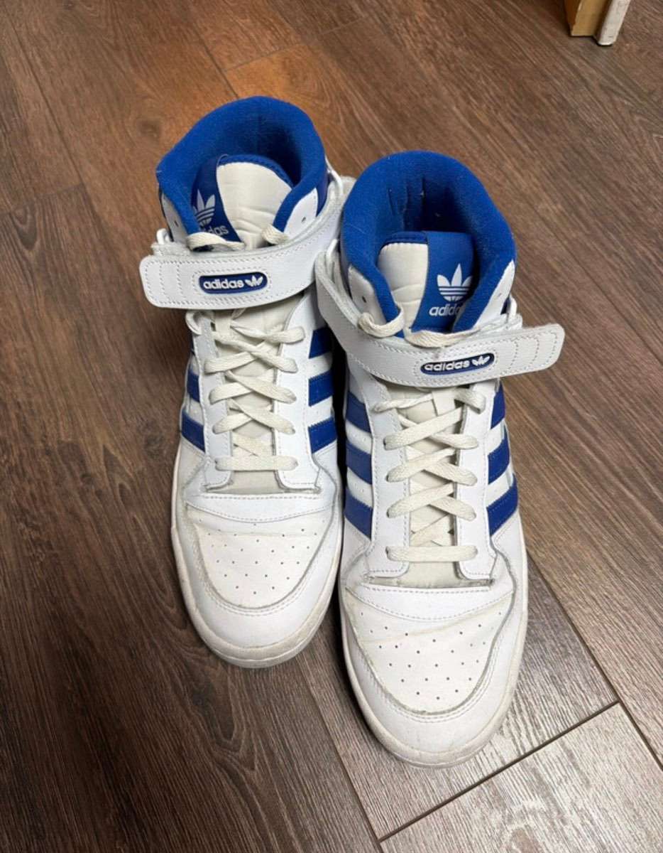 Gut erhaltene Adidas Forum Mid in klassischem Weiß mit blauen Streifen.