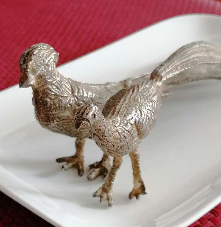 Antike Vögel, Fasane oder Auerhahn, aus Messing- Metall?