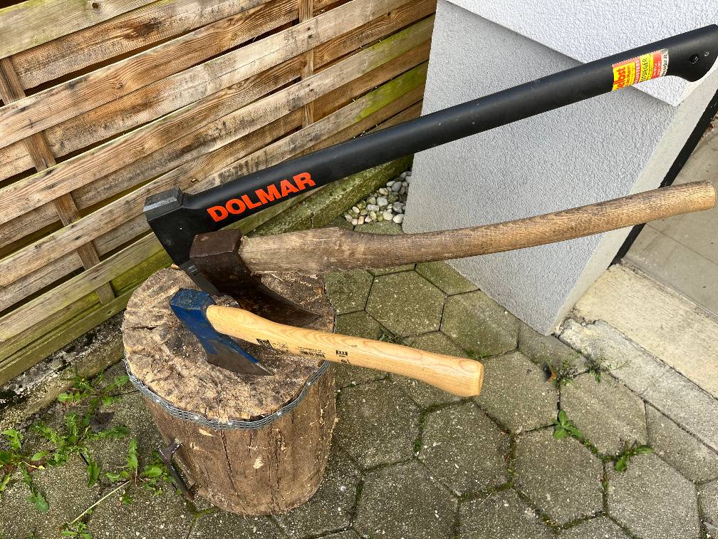 3 verschiedene Äxte + Hackstock