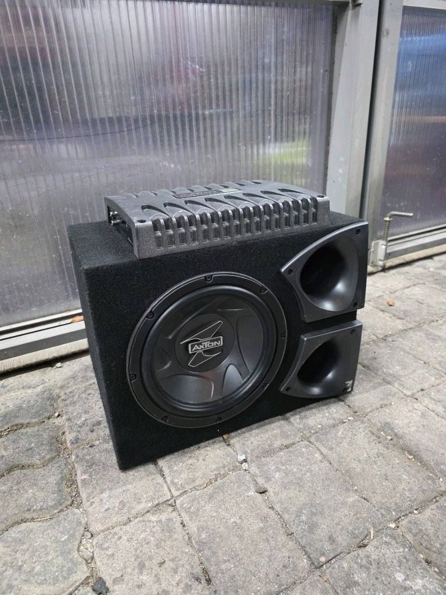 Der Sub ist ein Axton AB25 10 Zoll (25cm) Subwoofer mit 200 Watt auf 4 Ohm in einem Bassreflexgehäuse.