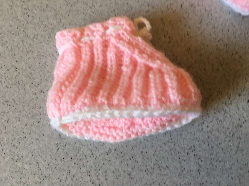 Babyschühchen in Handarbeit in hellrosa mit weiß kombiniert, angefertigt von Schwestern
