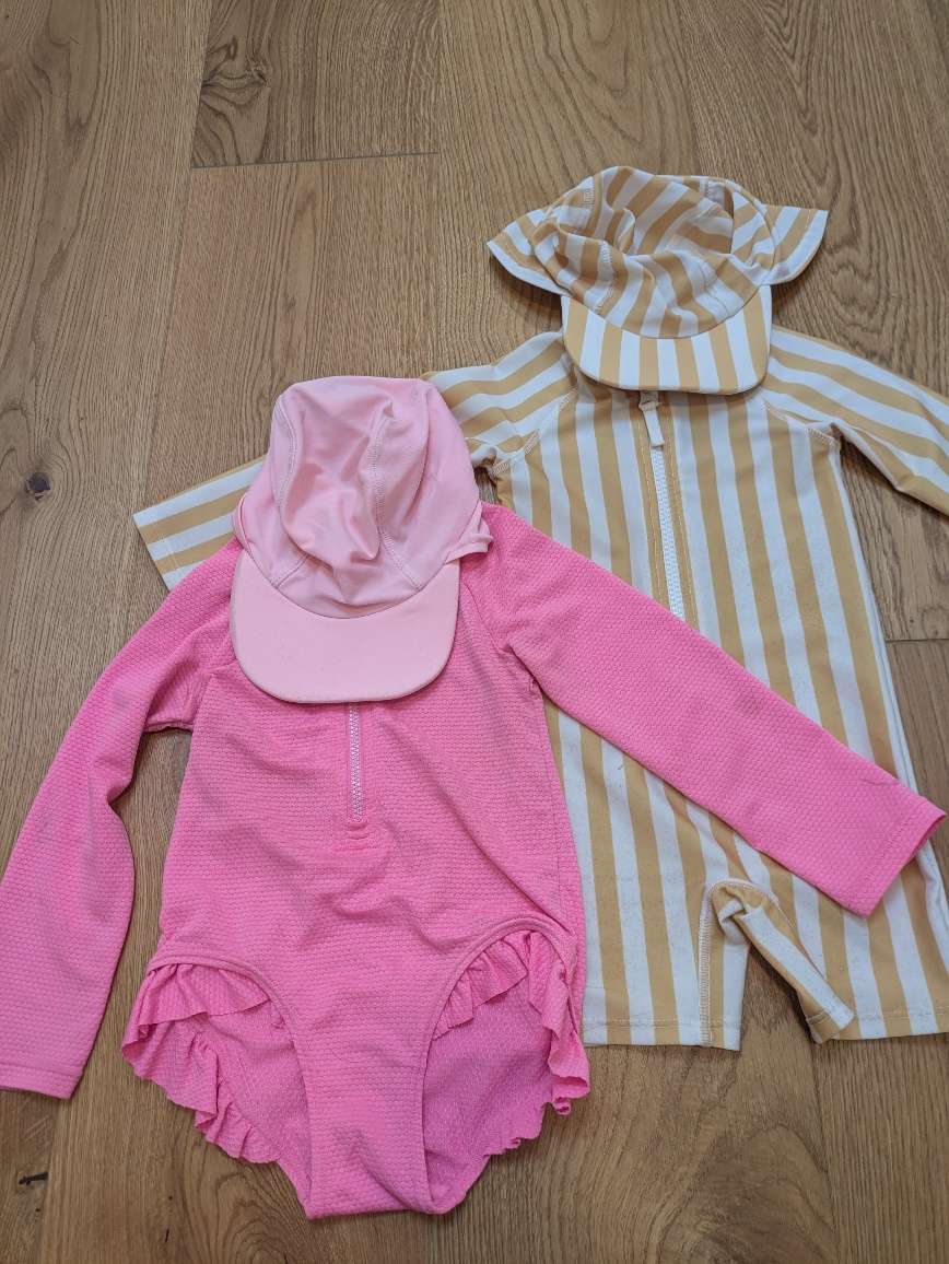 UV-Kleidung mit langen Ärmeln und inkl. Sonnenkappen zu verkaufen. Auf dem gestreiften Anzug sieht man ein paar kleine schwarze Punkterl vom Salzwasser, ansonsten völlig in Ordnung.