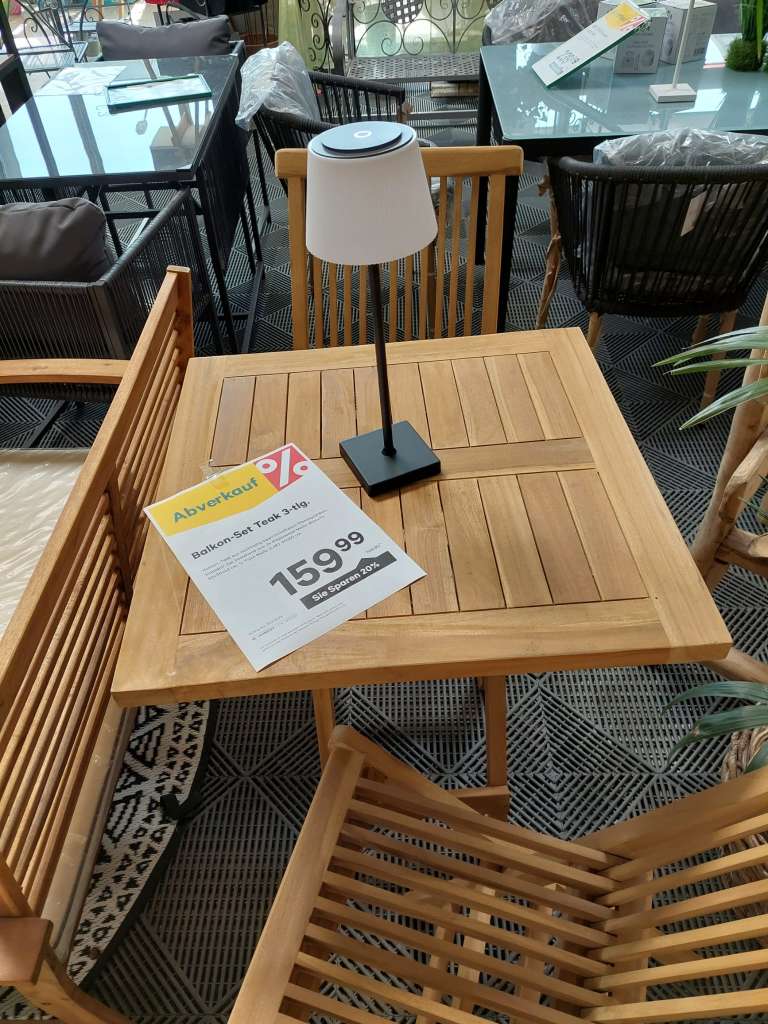 Das 3-tlg. Balkonset Teak besteht aus einem Tisch 60x60 cm und zwei Klappsesseln 65x90x43 cm. Die Möbel wurden aus indonesischem, zertifiziertem Premiumteak aus nachhaltig bewirtschaftetem Plantagenanbau hergestellt. Das Set ist klappbar und kann somit platzsparend aufbewahrt werden.