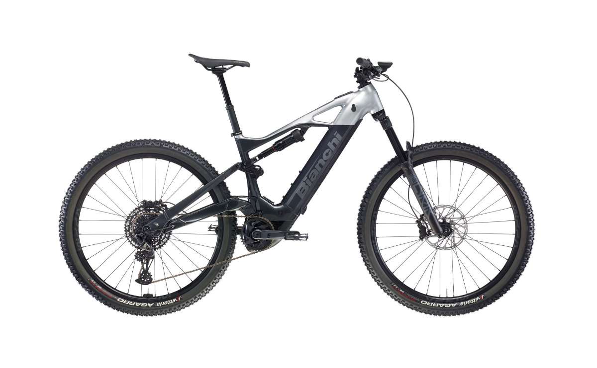 Bianchi e-Vertic FX, aluminium, 12x148 mm rear thru axle, Post mount 180 disc brake type, Front travel 150 mm, Rear travel 140 mm, Internal cable routing in steerer, 800 Wh battery compatible, sizes 40-44-48-53