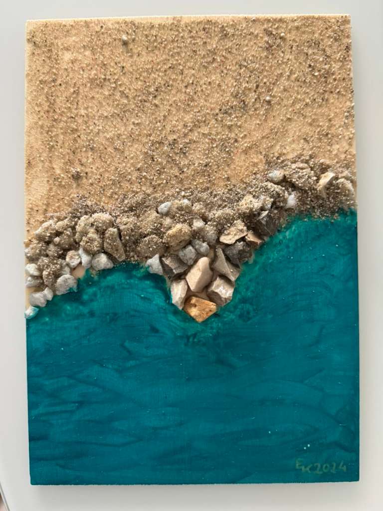 auf einer dünnen Holztafel gemalt und mit Steinen und Sand beklebt