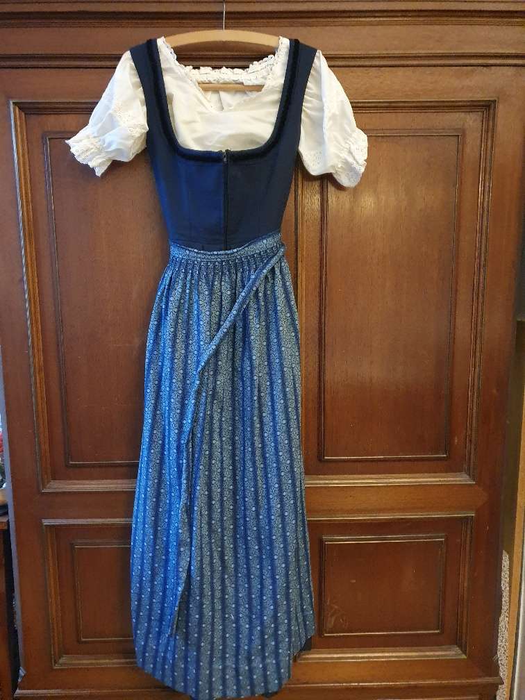 Bodenlanges Salzburger Dirndl mit Schürze und Dirndlbluse. Größe 36, aber sehr eng geschnitten für kleine zierliche Frau. Taillenbreite 31 cm, Gesamtlänge (Schulter bis Rocksaum 132 cm (Saum aufgeschlagen, kann verlängert werden), Schürzenlänge 92 cm (ebenfalls Verlängerung möglich). Farbe: Kleid dunkelblau mit schwarzer Borte am Halsausschnitt, Schürze blau-gemustert. Bluse weiß.