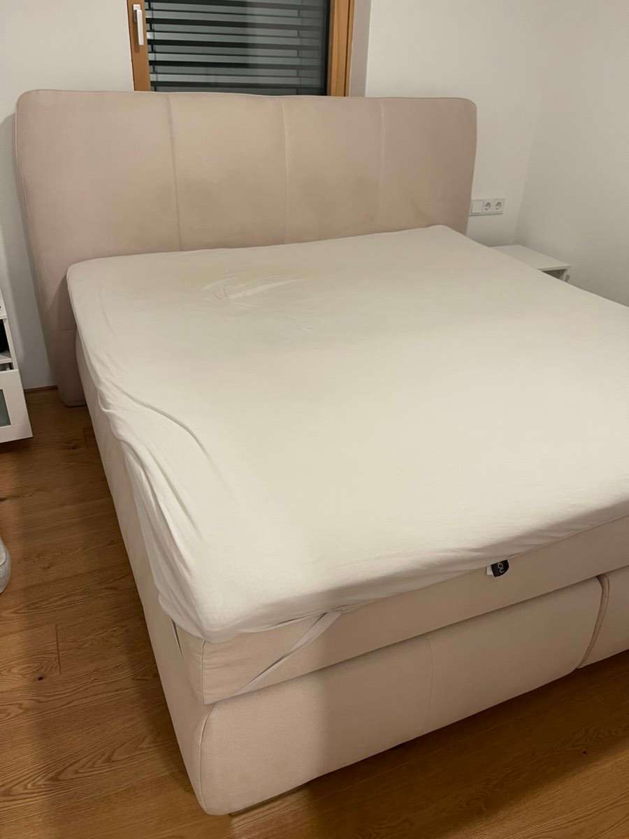 Sehr gepflegt, kaum Gebrauchsspuren (siehe Fotos). Bezug sauber, nicht beschädigt. Keine durchgelegene Matratze, Topper in gutem Zustand.