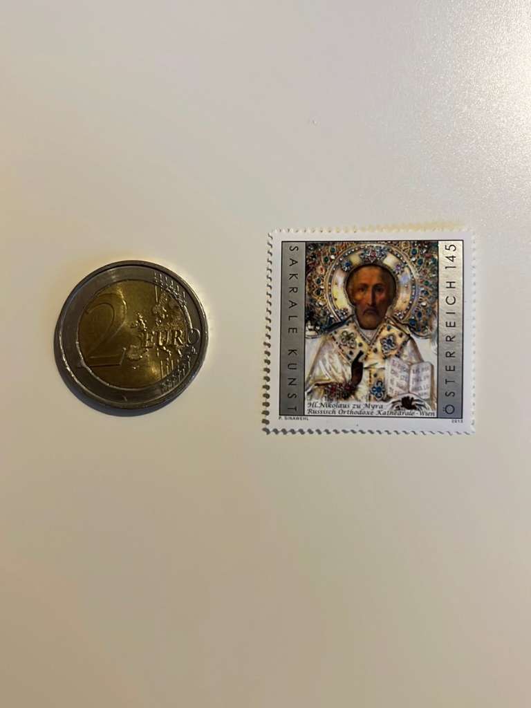 Mit der vorliegenden Sondermarke findet die attraktive Serie „Sakrale Kunst in Österreich“ nun ihre ästhetische Fortsetzung. Das Markenmotiv zeigt die eindrucksvolle Ikone des Heiligen Nikolaus zu Myra aus der Russisch Orthodoxen Kathedrale im 3. Wiener Gemeindebezirk.
