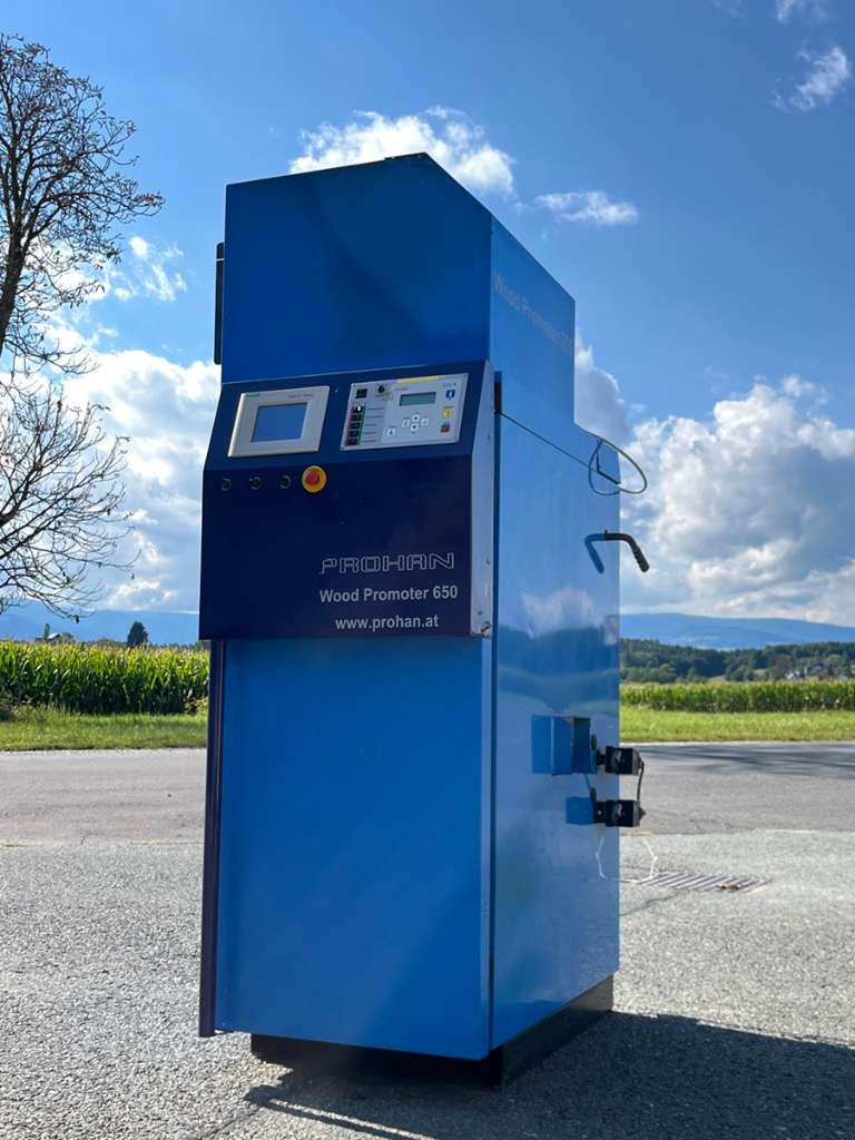 Es handelt sich um einen seitens der Firma Proham gefertigten Woodpromoter 650! Hier wurde eine Automatische Stückholzbestückung verbaut mit eigenem Ladebunker und Regelung.