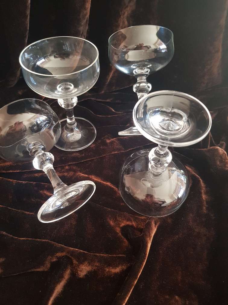 4 Champagner- Cocktailschalen vermutlich aus den 1960er Jahren, 10 cm hoch Durchmesser 7 cm sehr schöne Verarbeitung am Stiel, die Gläser haben keine Beschädigungen