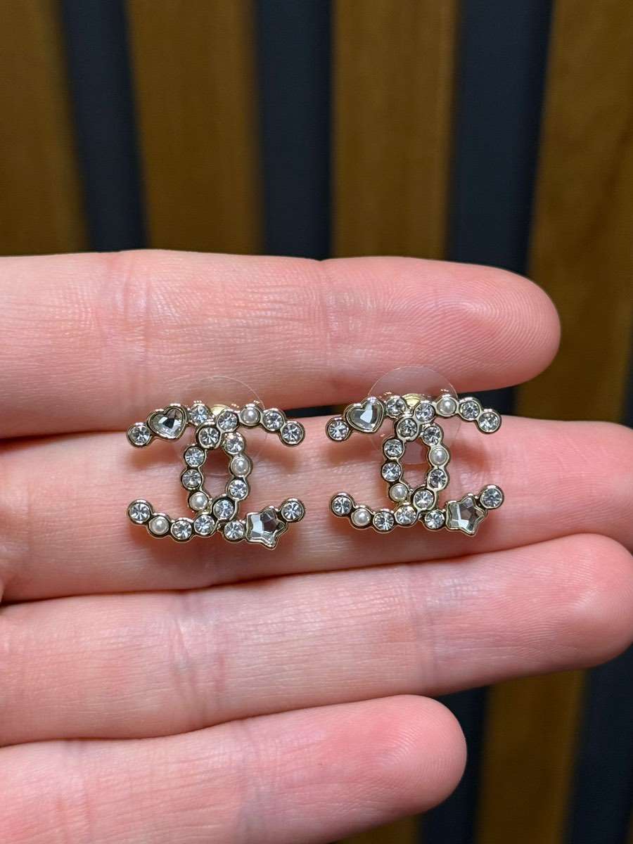 Die Ohrringe haben ein klassisches Chanel-Design mit dem charakteristischen CC-Logo, das mit funkelnden Kristallen besetzt ist. Zusätzlich sind sie mit schönen Perlen verziert, die dem Ganzen einen edlen Touch verleihen.