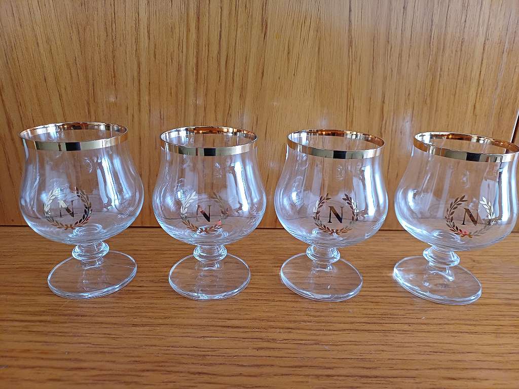 4Stück Cognacgläser mit goldenem Rand, den Anfangbuchstaben N (Napoleons) und ist mit einem Loorbeerkranz umgeben. Wurden nie benutzt standen immer nur in der Vitrine! In der Wurlitzergasse abzuholen.