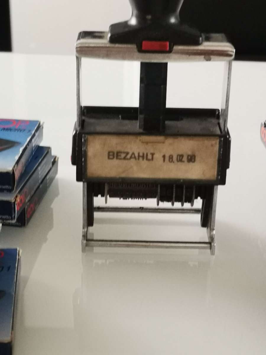 Technologie: Selbstfärbender Stempelmechanimus mit verstellbaren Bändern für das Datum.