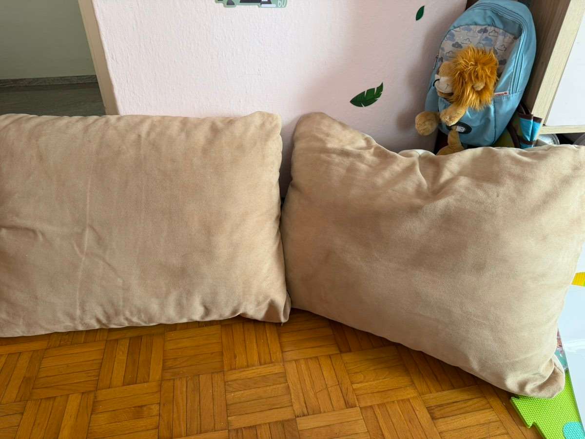 Der Stoff ist weich und angenehm, normale Gebrauchsspuren sind vorhanden. Keine groben Beschädigungen ersichtlich.