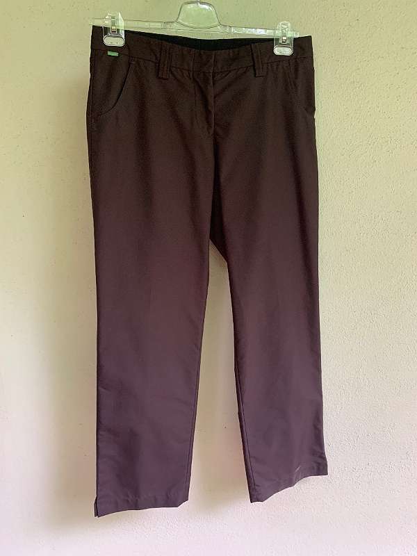 Verkaufe eine Damengolfhose der Marke Backtee in Größe 42 - Farbe braun glänzend - 100% Polyester - Zipp mit Steckverschluß innenseitig - 44 cm Bundweite und ca. 5,50 cm breite Gürtelschlaufen - 23,50 cm untere Hosenweite mit 5 cm langem Schlitz - seitlichen Eingrifftaschen - rückwärts mit aufgenähten Taschen - 104 cm Hosengesamtlänge und 78 cm Schirttlänge - 55 cm Weite oberhalb des Schrittes gemessen.