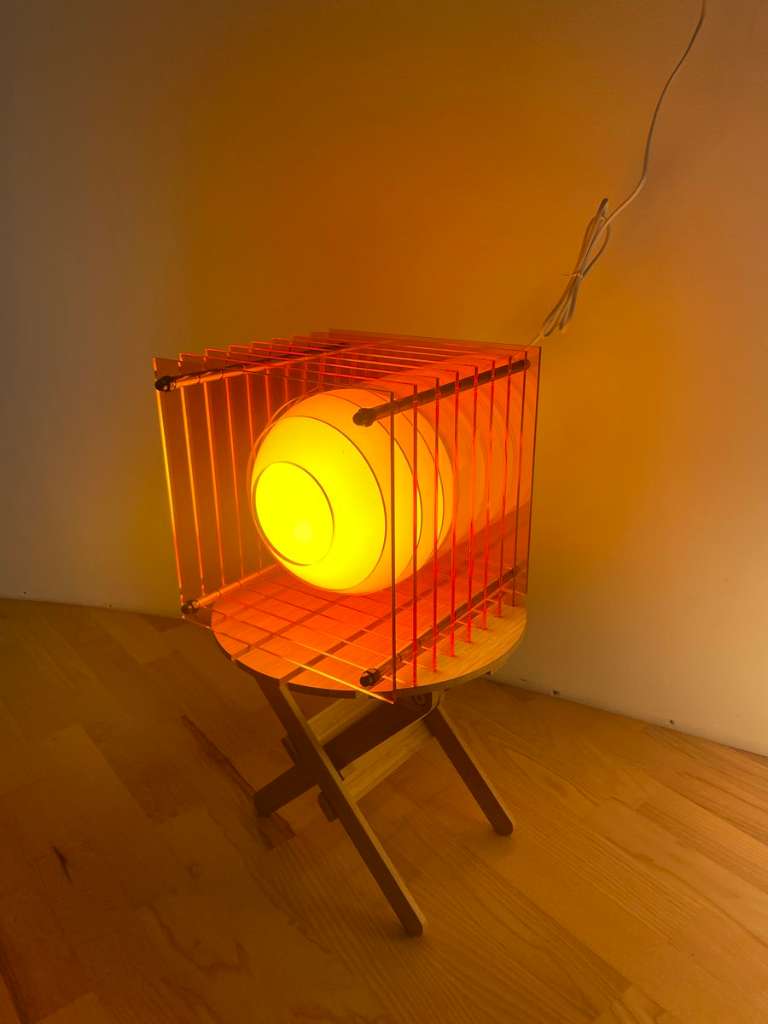 Besteht aus neun transparent-orangenen AcrylSchichten und einer gläsernen Opal-Glaskugel, die beim Einschalten faszinierende Reflexionen erzeugt – wie eine schwebende, sich bewegende Kugel