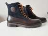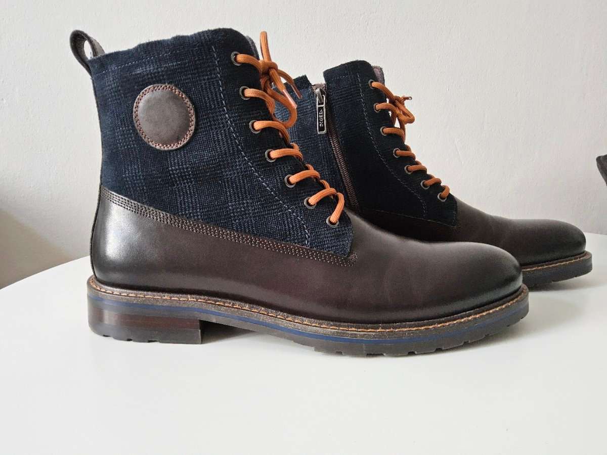 Edle Kombination aus dunkelbraunem Glattleder und robustem Textilmaterial im Schaft, mit klassischer Schnürung, zusätzlichem seitlichem Reißverschluss sowie stabiler Profilsohle. Hochwertige Verarbeitung, zeitloser Stil – ideal für Herbst und Winter.