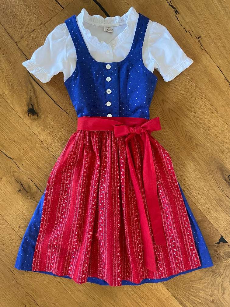 Farbe: blau, Schürze rot, handgenäht