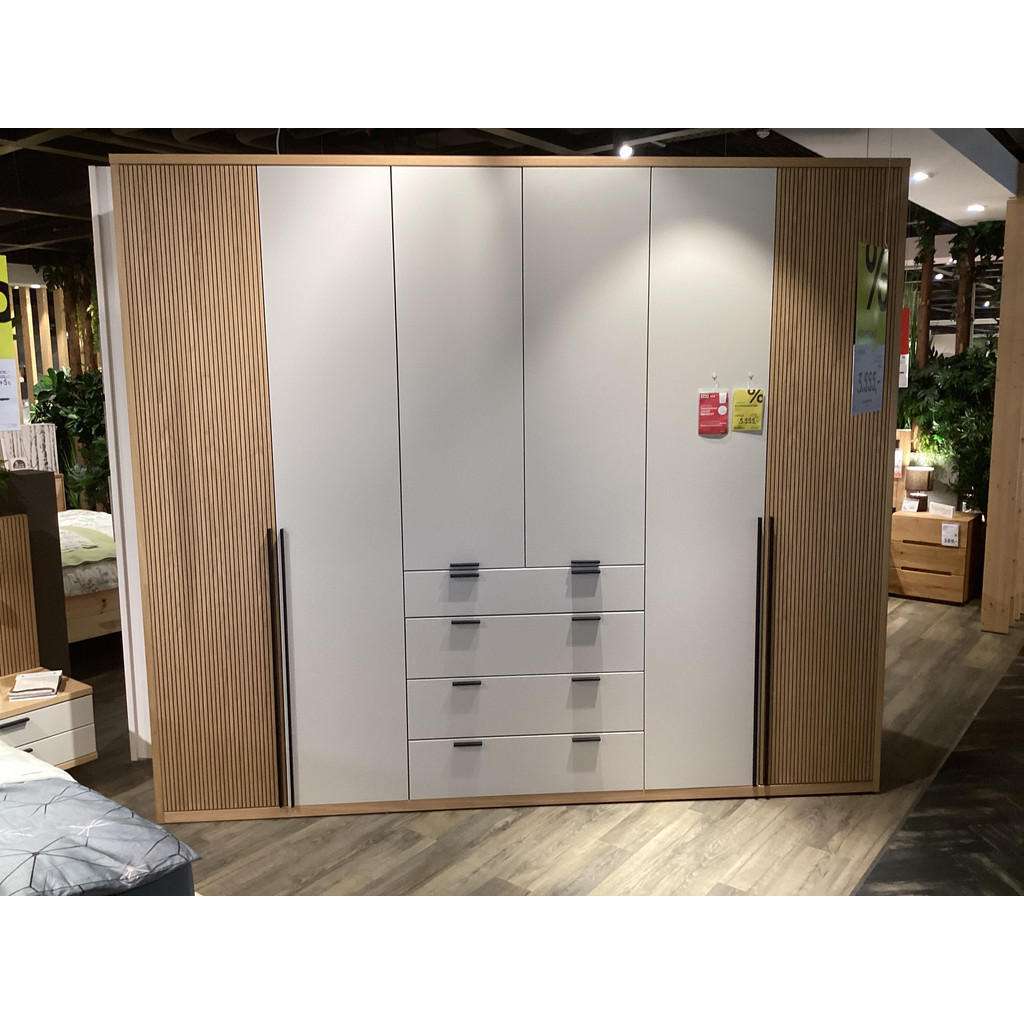 Drehtürenschrank in Lach Seidengrau mit Türen in Eiche Sand, inkl. Innenausstattung mit Beleuchtung, B/H/T 280/240/62 cm Ausstellungsstück