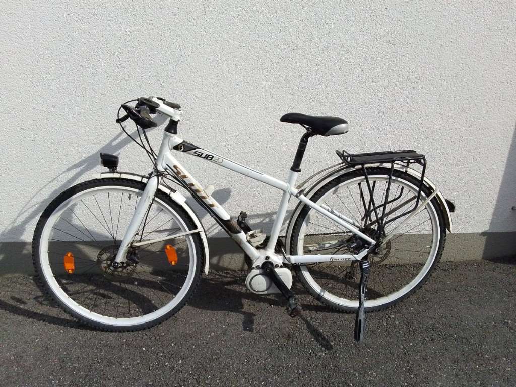 Motor zeigt Geräusche (koppelt nicht vollständig), eine Bremse ist zu reparieren und Kette sollte erneuert werden, kein Gepäcksträger. Display hat einen Sprung, funktioniert aber.