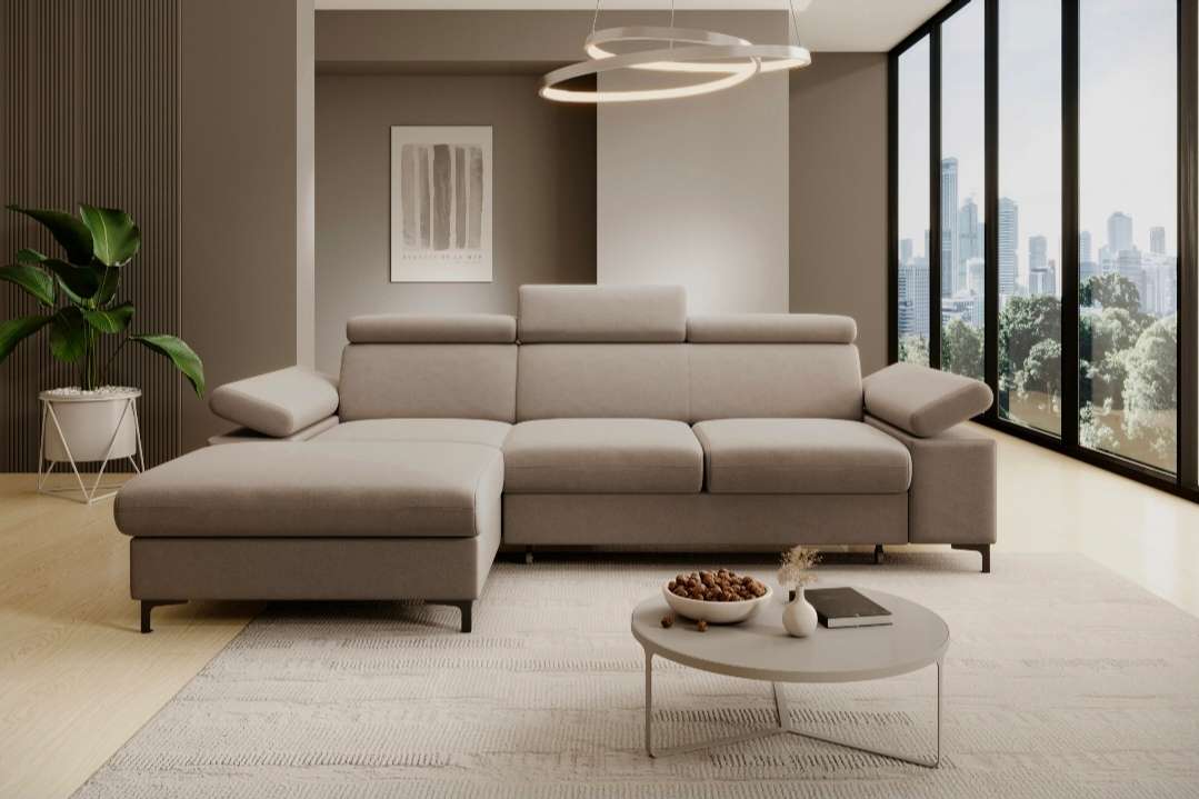 Das Ecksofa Mavic mit verstellbaren Kopfstützen hat eine Schlaffunktion und einen Behälter für Bettzeug. Seine kompakten Abmessungen eignen sich auch für kleine Räume. Bei diesem Modell haben wir die Möglichkeit geschaffen, die Stoffe vollständig individuell zu gestalten.