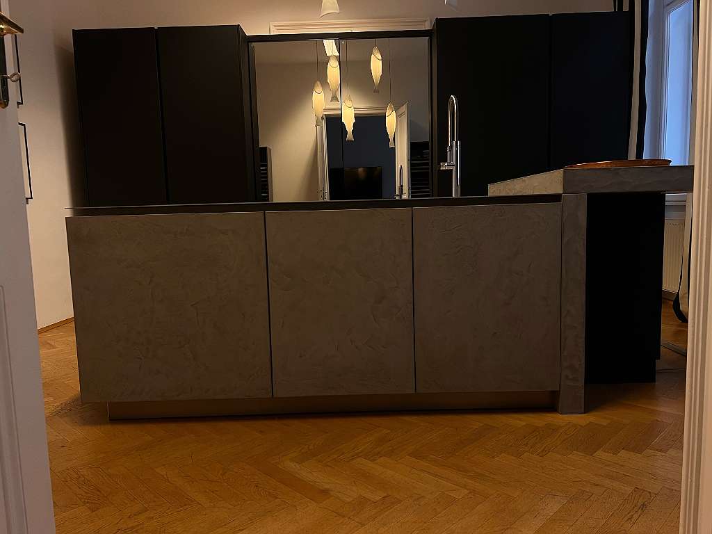 Inselblock mit Edelstahl Arbeitsplatte und Betonfronten