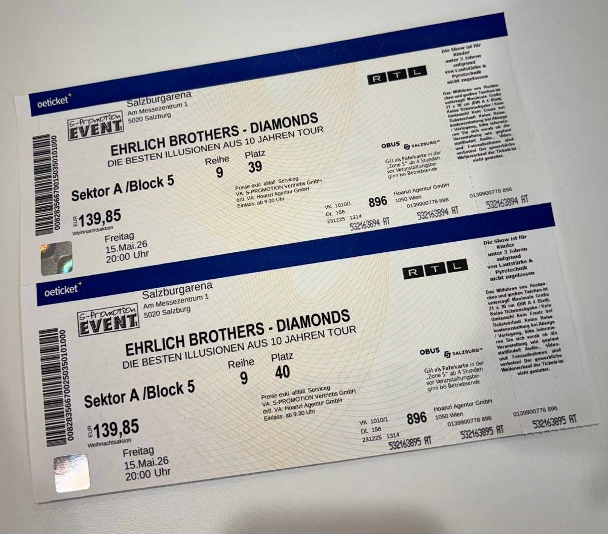 Sektor A/Block 5, Reihe 9, Plätze 39 und 40