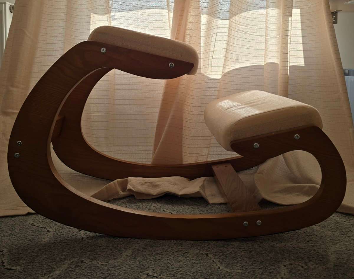 Gestell aus Holz, Kissenbezug beige. Mit Filzleisten um den Boden zu schonen.