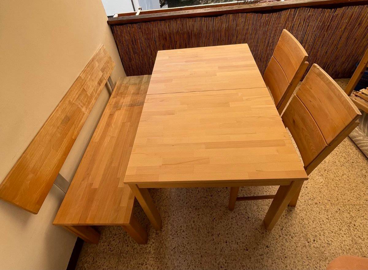 Stabiler massiver ausziehbarer Esstisch (L 125 cm ausgezogen 165 cm B 80 cm H 74,5 cm) + 2 Stühle (ohne die Bank auf dem Bild).