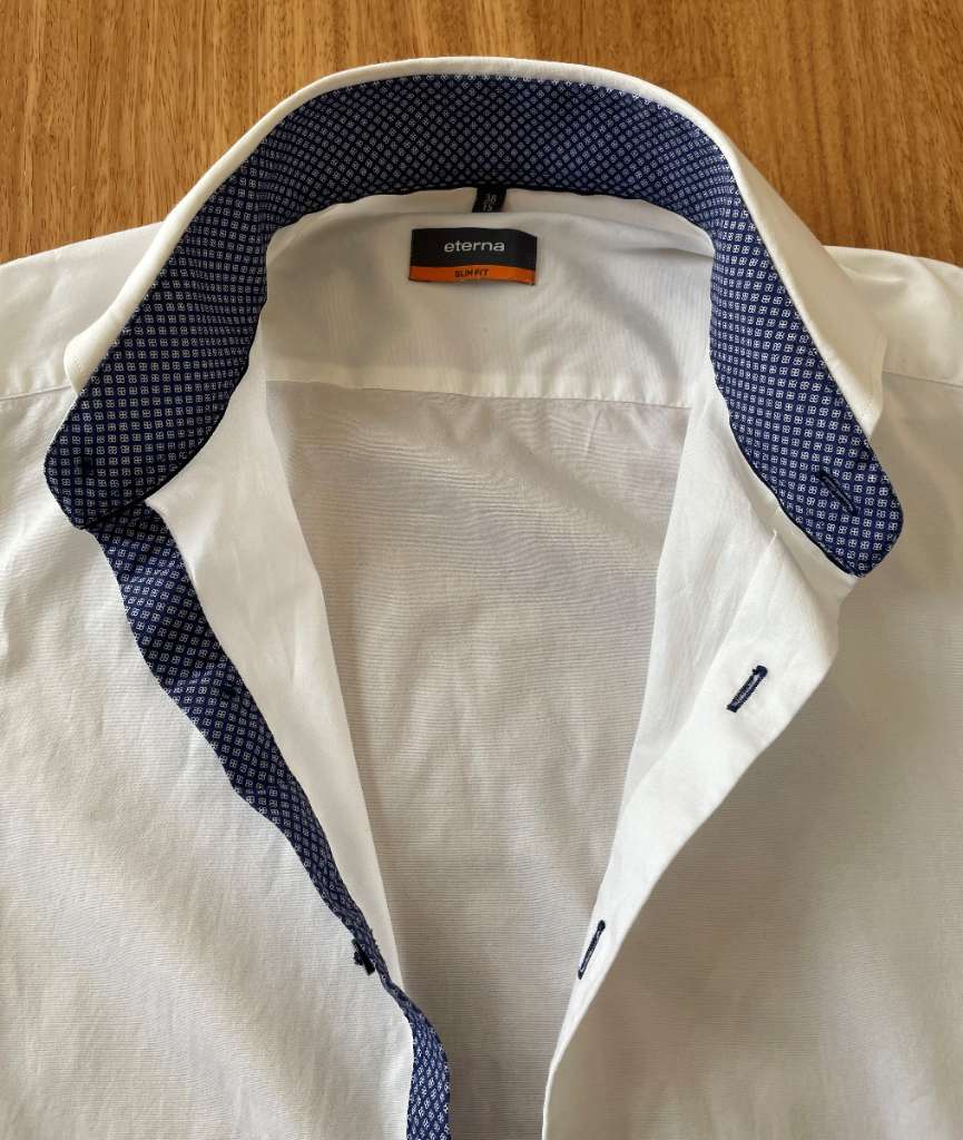 Eterna Businesshemd / Anzughemd in weiß mit blauem Kontrastmuster an der Innenseite von Kragen und Manschetten sowie der Knopflochleiste,