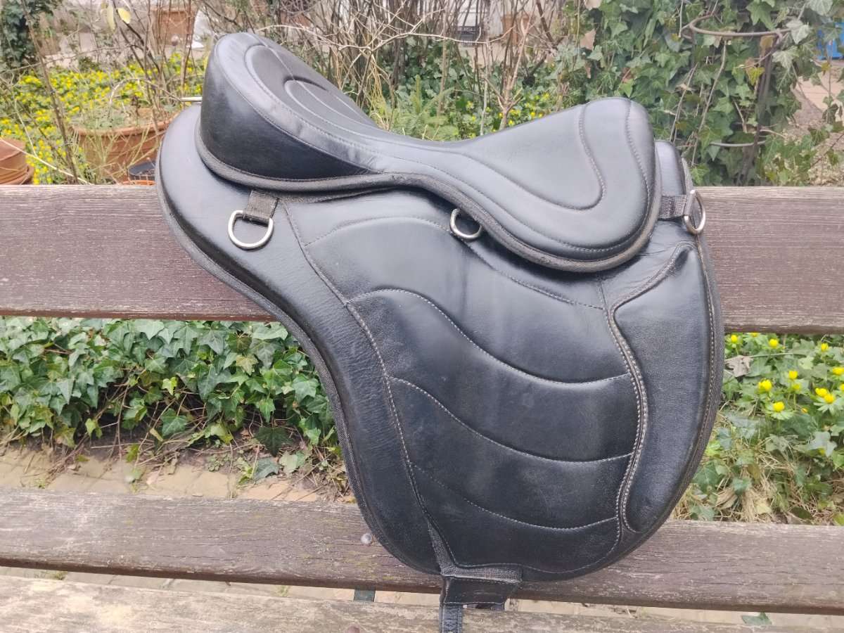 Baumlos, daher flexibel und auf viele Pferde passend, benötigt Unterlagen mit Wirbelsäulenfreiheit, Kurzgurt; Steigbügelaufhängung vorhanden. Eher kleine Sitzfläche (abklettbar).