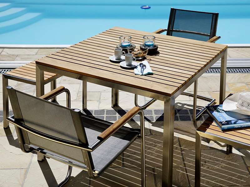 Das Tischset besteht aus einem Belmond Tisch 100x100cm Teak/Edelstahl und 4 Stück Timor Stapelsessel. Die Sessel sind aus Edelstahl und bespannt mit wetterfestem Arano Textilen.