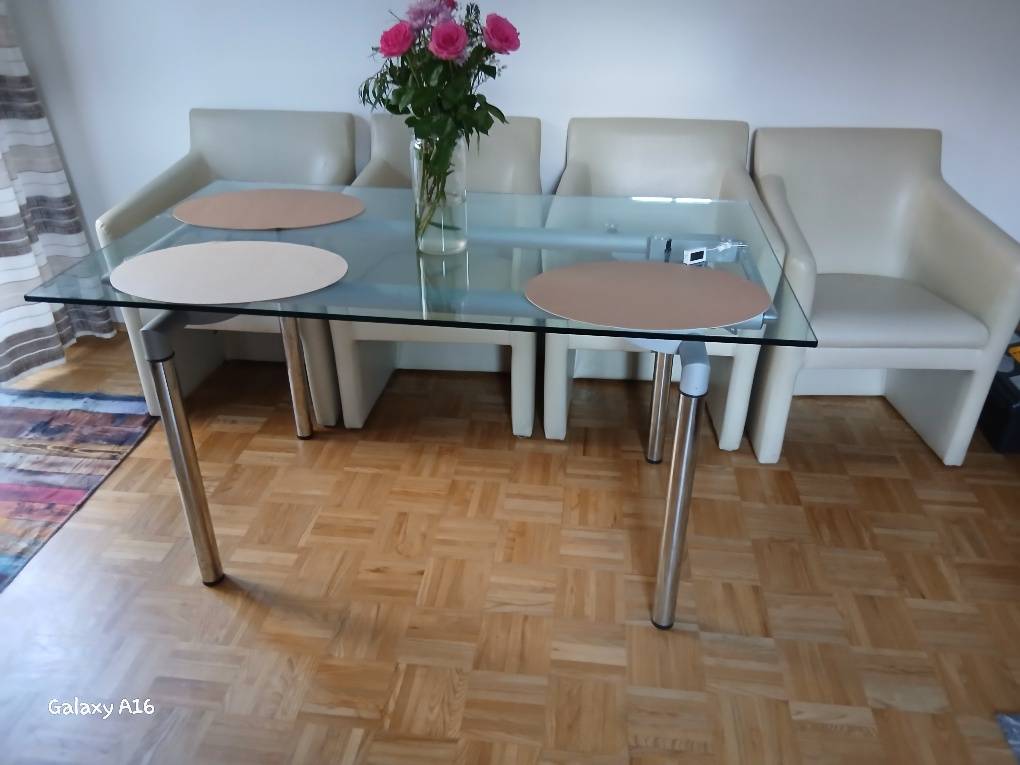 Glastisch mit vier Ledersesseln, einige haben Flecken