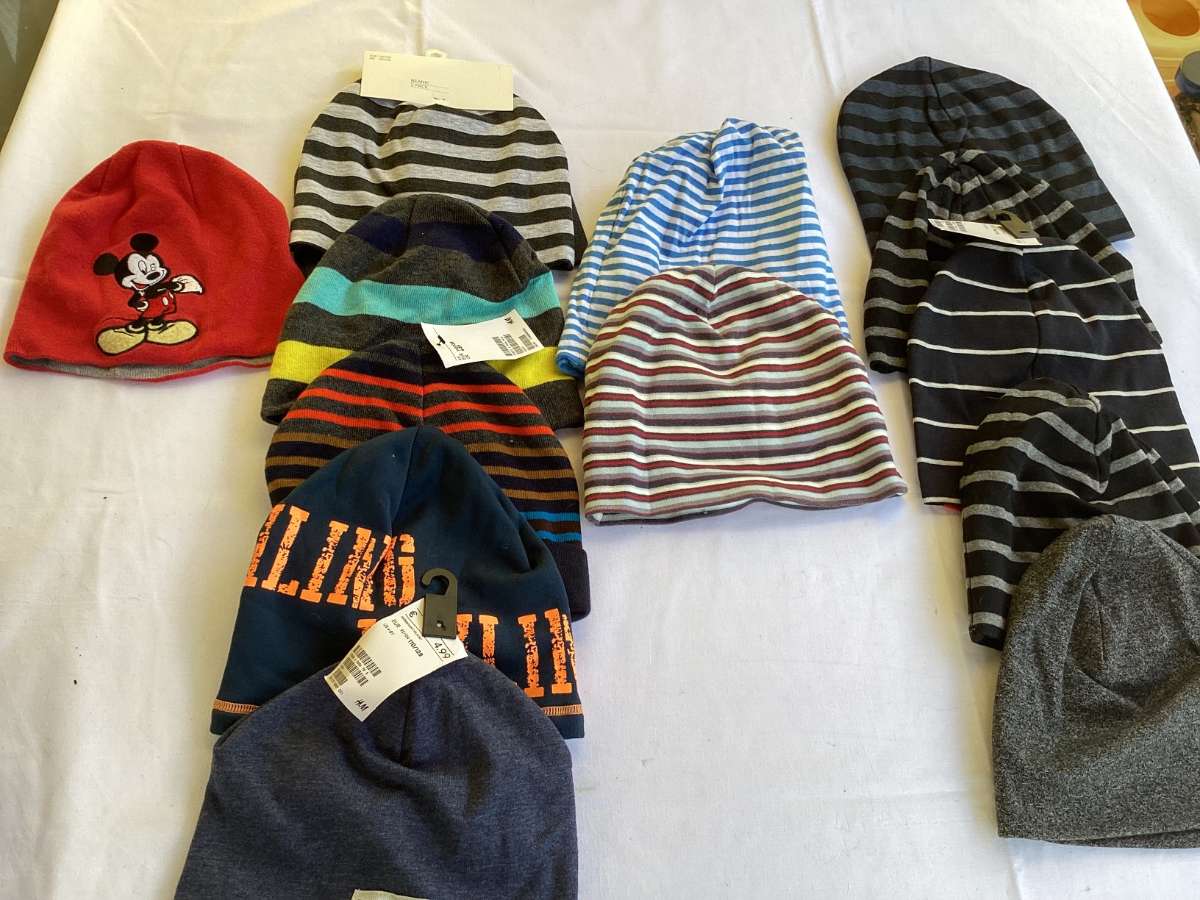 Verschiedene Hauben in Strick oder Baumwolle.