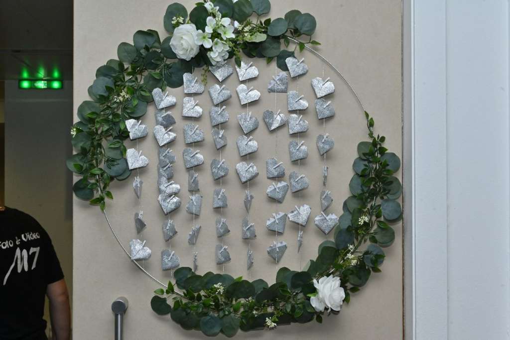 Alleine der Ring in dieser Größe hat 30 Euro gekostet, plus die Kunstblumen nochmal 20 Euro, von dem Arbeitsaufwand mal ganz abgesehen! Aber es hat sich ausgezahlt, ist super gut angekommen bei unserer Hochzeit!