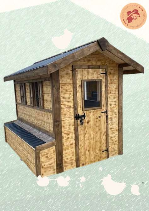 Blechdach 0,5mm. Hausgiebel und Wetterleisten mit Blech verkleidet. Unter dem Blech wird Bitumen-Dachbahn verlegt. Kantenschutz an der Legebox. 2 x vernetzte Kunststofffenster 80x40cm verglast zum kippen. 3 x Fix/-Fenster 20x60cm (Plexiglas). Holztüre mit Fenster (Plexiglas). Das Kotbrett aus ECO Platten/wasserresistent. 2 x Sitzstangen.