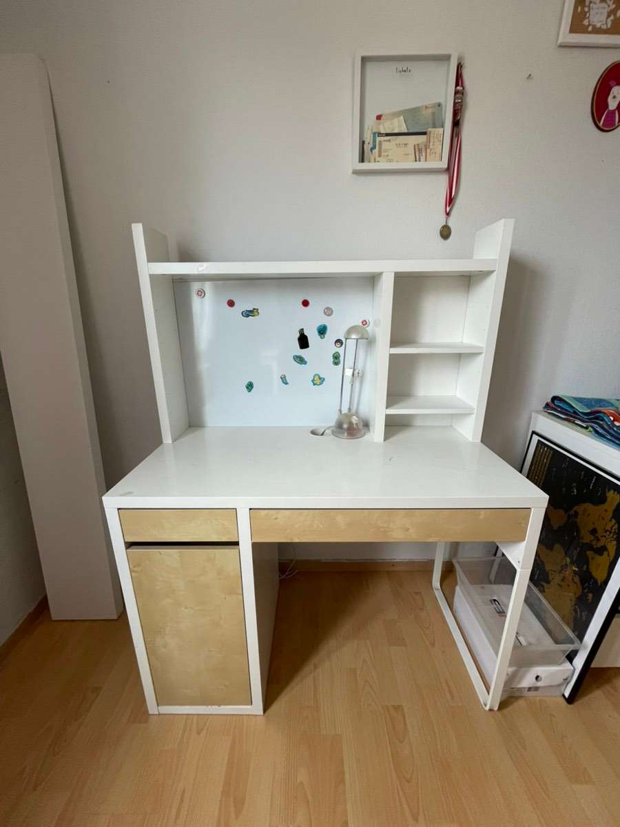 Verkaufe einen gut erhaltenen IKEA Schreibtisch in Weiß und hellem Holzton, ideal für das Kinder- oder Jugendzimmer.